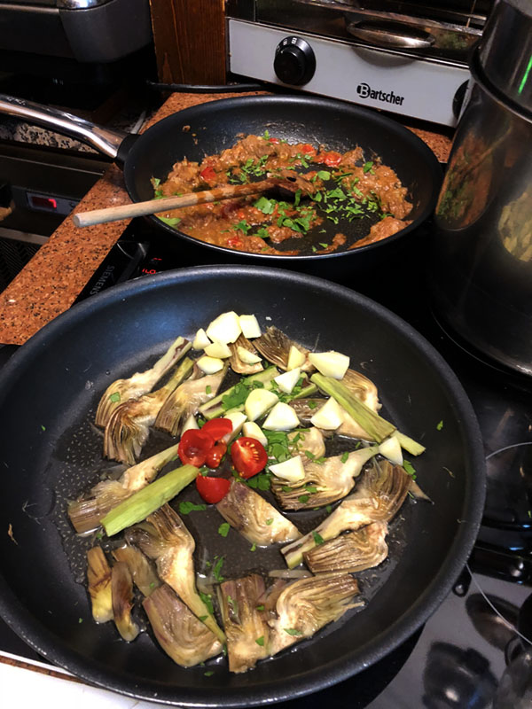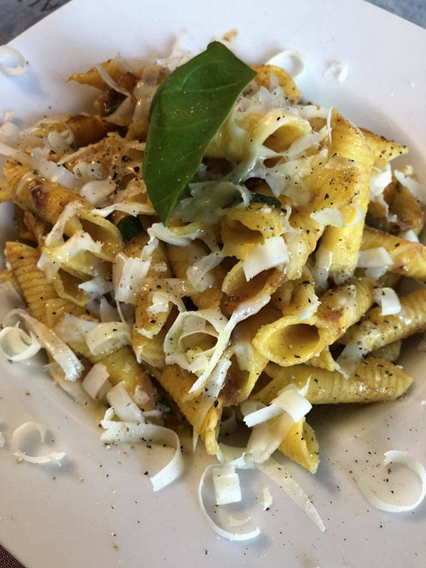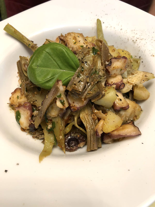 O gün Şef Rizzo Mario’nun dört döndüğü ufacık mutfaktan payıma düşen ilk yemek, lokum misali osso buco, yani dana incik ile taçlandırılmış garganelli tipi makarna oldu. Tavada özel sosla sotelenen et, pişirme aşamasında makarnanın haşlama suyuyla da tanışınca lezzet yeni bir kademeye atladı. Parmesan, zeytinyağı ve fesleğen birlikteliğinin eseri al dente makarnanın haricinde deniz mahsüllü ve enginarlı tabak da yüz güldüren bir diğer reçeteydi.