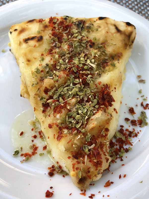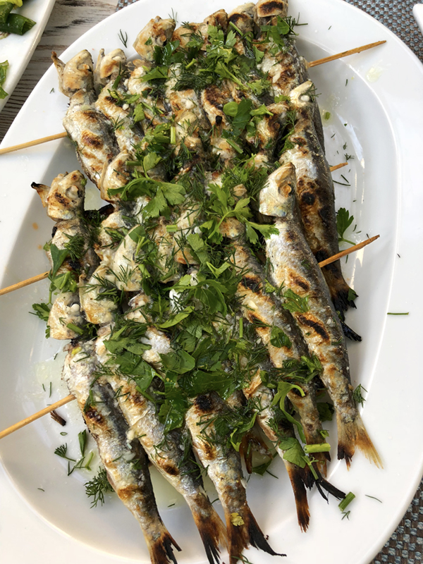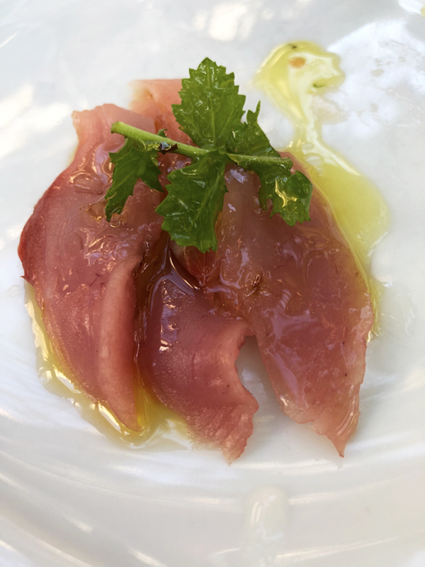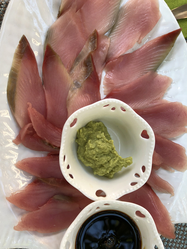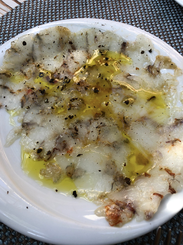 Karides carpaccio, üzerine gezdirilen soğuk sıkım Ege zeytinyağı, limon kabuğu rendesi ve taze çekilmiş karabiber ile oldukça leziz bir versiyon. Ağızda eriyip giden torik sashiminin yanında bu işin klâsiği olan wasabi ve soya sosu var. Ancak Ege’nin incisinde olduğumuzu hesaba katarak, benim tercihim yine zeytinyağından yana...