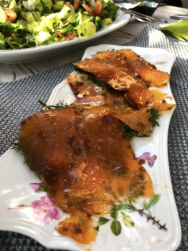 Elbet sevenleri vardır; ancak balıkta çemen tadı ve dolayısıyla pastırma fikri benim pek de hoşuma gitmediğinden, kül üstünde tütsülenmiş somon pastırması – masanın kalanından topladığı büyük beğenilere rağmen –yalnızca tadına bakıp bıraktığım bir reçete. Izgara sepet peyniri geleneği bozmayan bir lezzet bombasıyken; avokado, çilek ve acı biberle yakıştırılan karides tartar, damağı şaşırtan, başyapıt derecesinde yaratıcı bir kombinasyon olmuş.