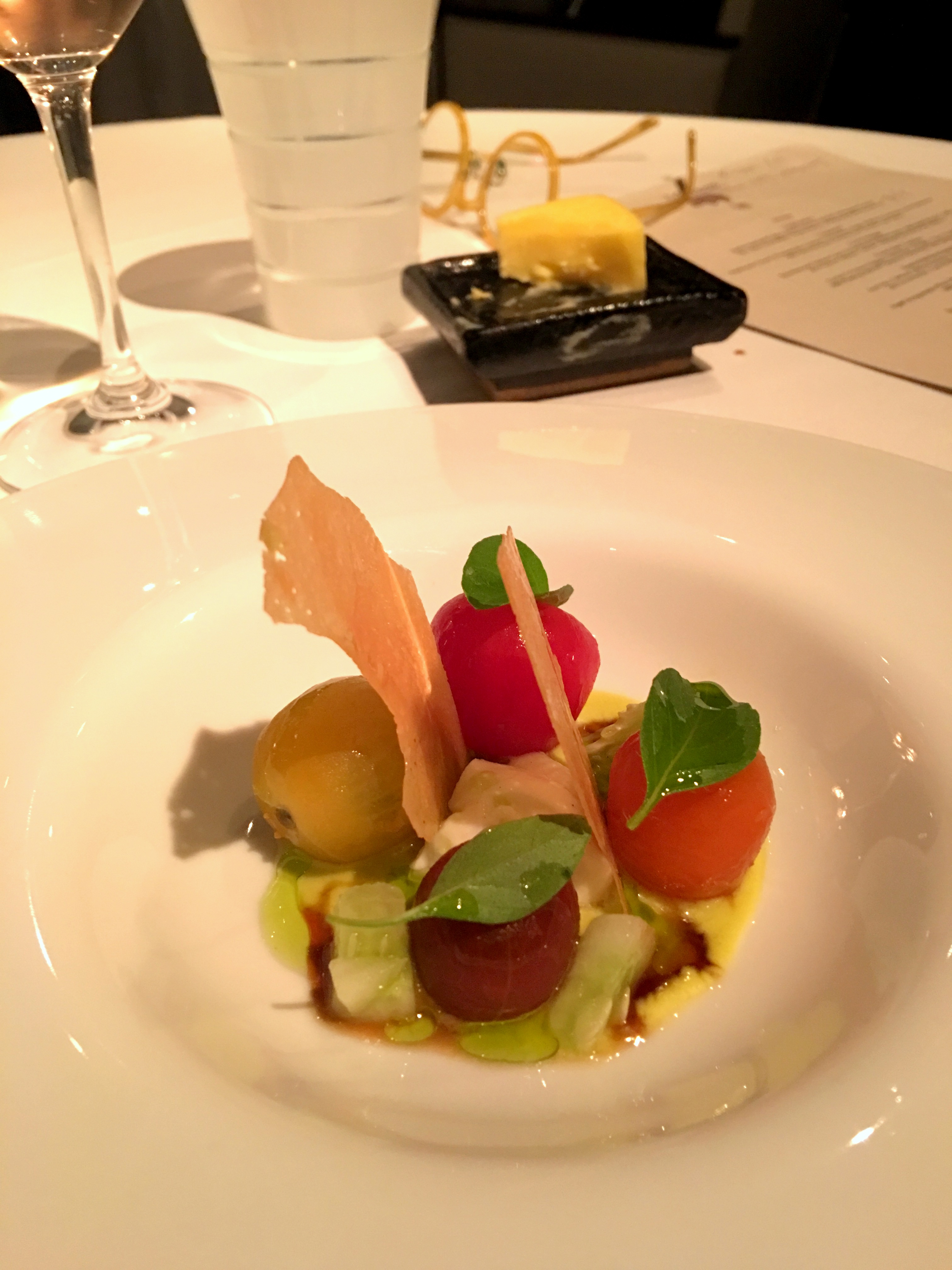 The staple dish on the menu, caviar was accompanied by some delicious pastry. However, I would prefer to have my egg medium-boiled. Following that was an interesting caprese dish whose recipe interestingly included white chocolate as well. Right after that, corn soup with chanterelle and black truffle left a disharmonious taste on my palate.