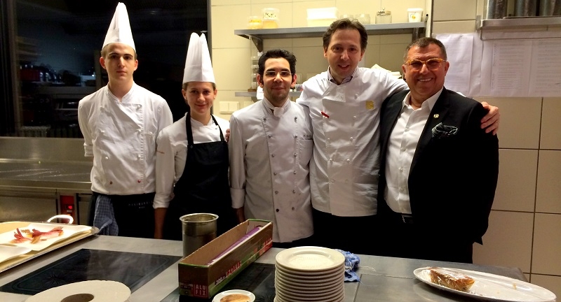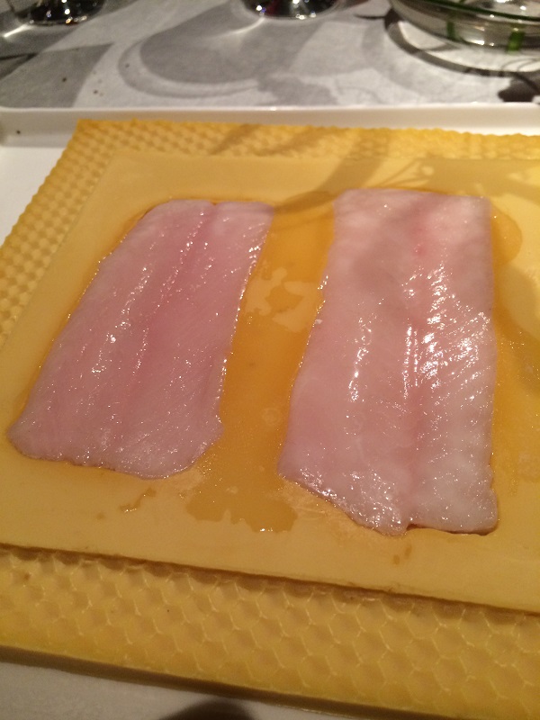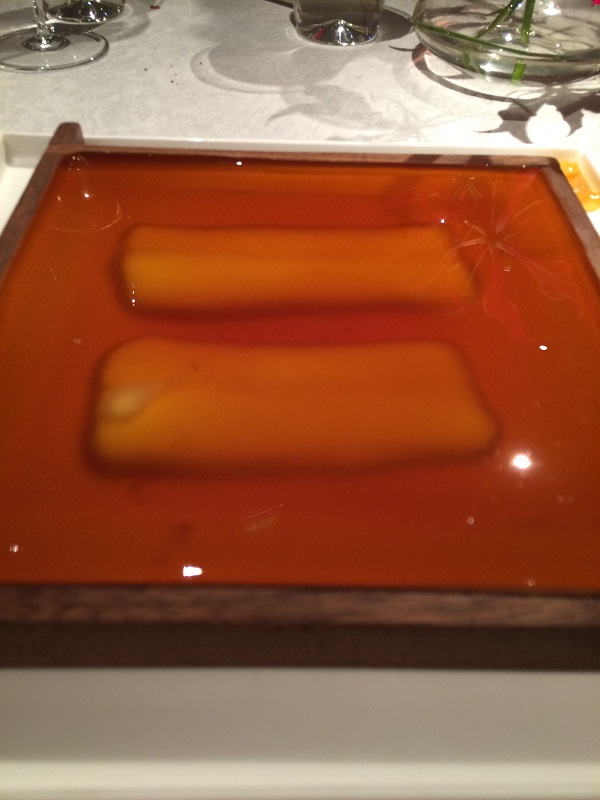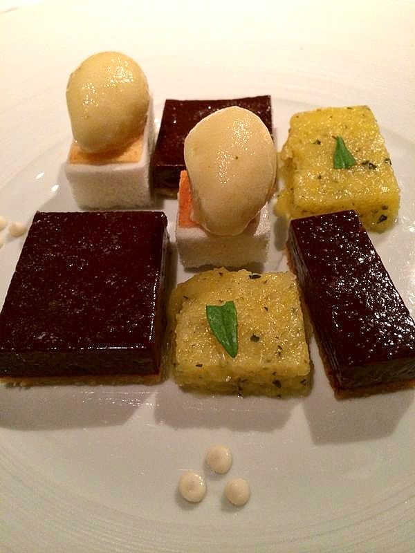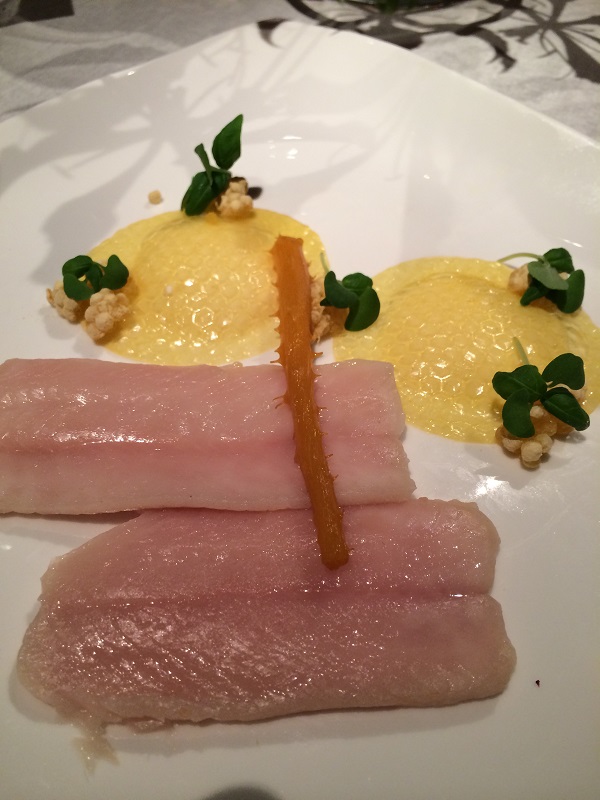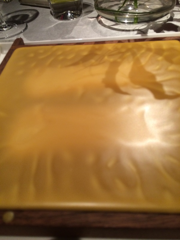 The most creative dish of the night was fish in beeswax. It was made with “salvelinus”, a type of trout that lives in fresh cold waters. First the thin filets of fish were placed in a wooden mold in the shape of a honey comb and then the mold was filled with beeswax. In a short time, the wax gets set and then the filets were cooked in a preheated oven at 200 degrees for about 10 minutes. Boosted with quince vinegar, yellow radish called “rutabaga”, dried carrot and basil, the dish was the star of the night with its preparation, presentation and taste.