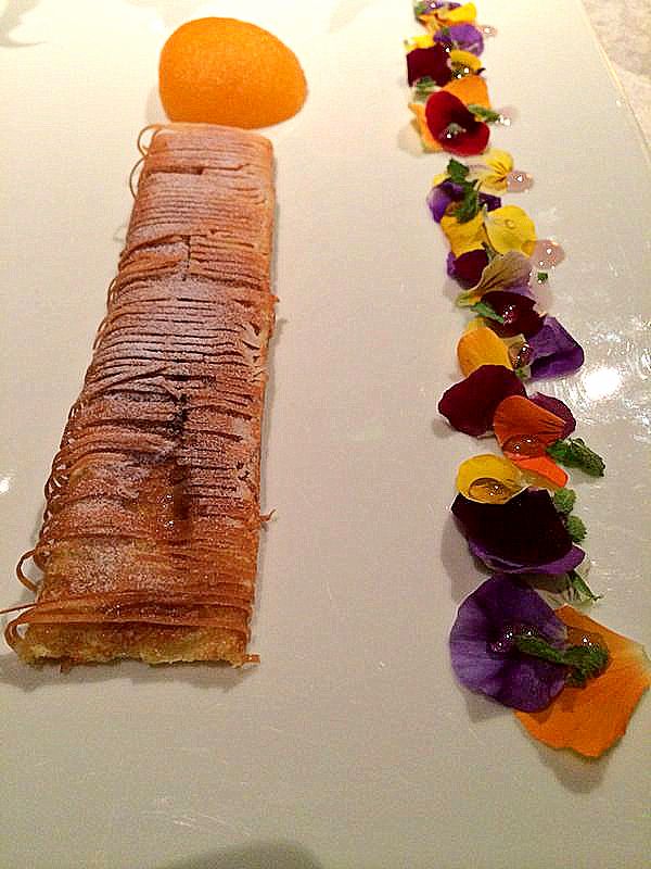 For the desserts, we had two stylish selections: crispy crepe with Japanese medlar sprinkled with violets and warm trinitario – chocolate pudding with pineapple-pericon sorbet and coconut macaroons.