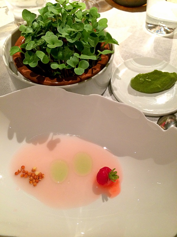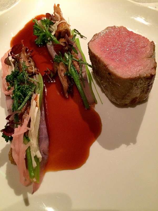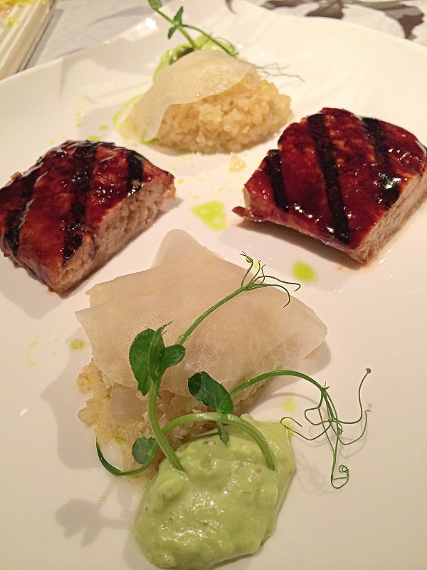 The barbecued sturgeon was coated with fermented pear juice, elderberry juice and balsamic vinegar. It also came with the Peruvian grain “quinoa” and kohlrabi along with chives cream.