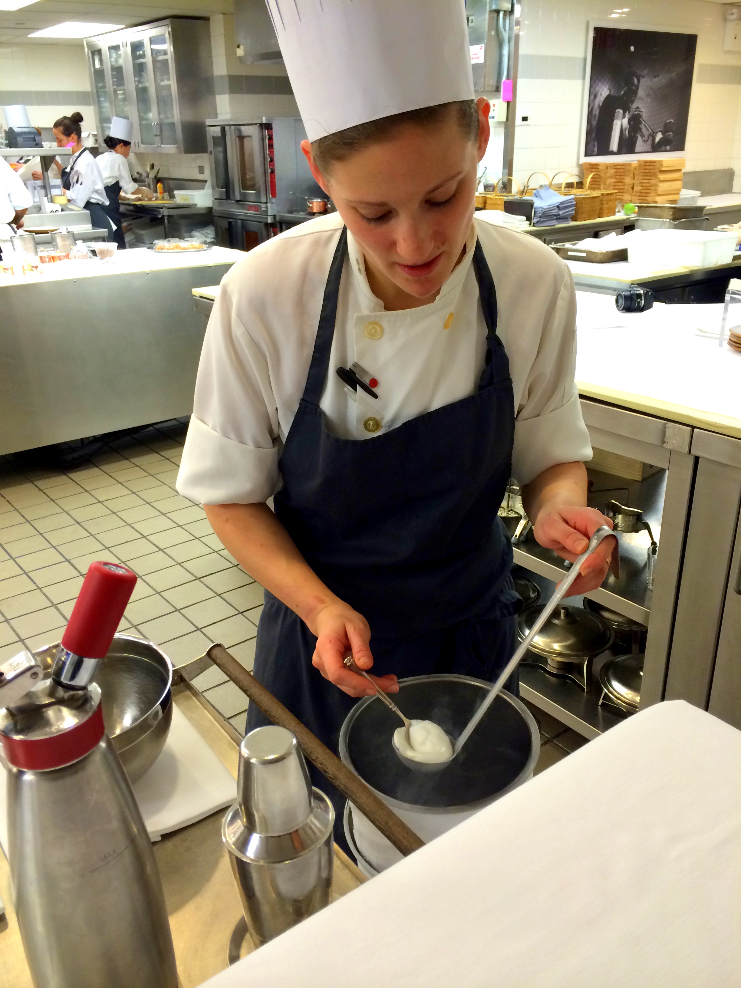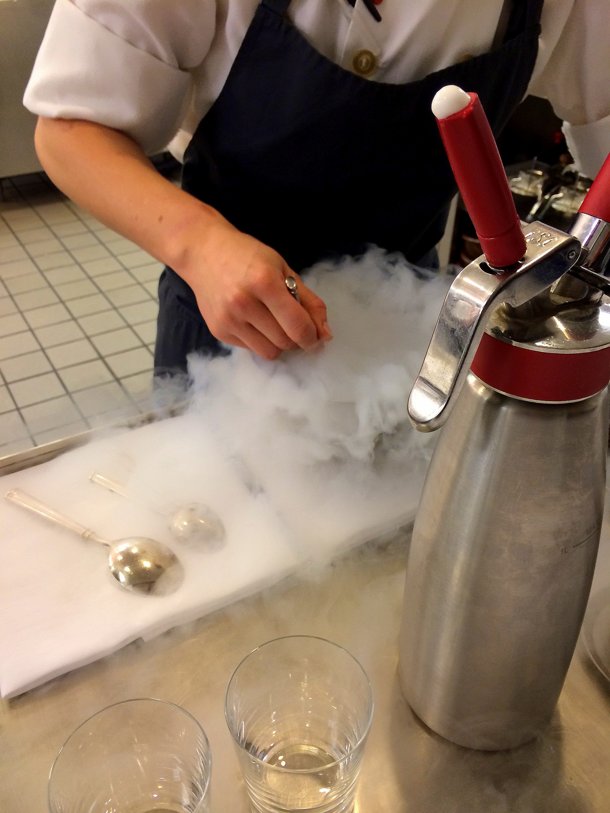 While we were touring the kitchen, we were invited to sit at a small table with a penicillin cocktail offer as a treat. It was a combination of bourbon whiskey, ginger and honey in the style of molecular cuisine. Besides, watching it getting prepared was just as much enjoyable as eating it.