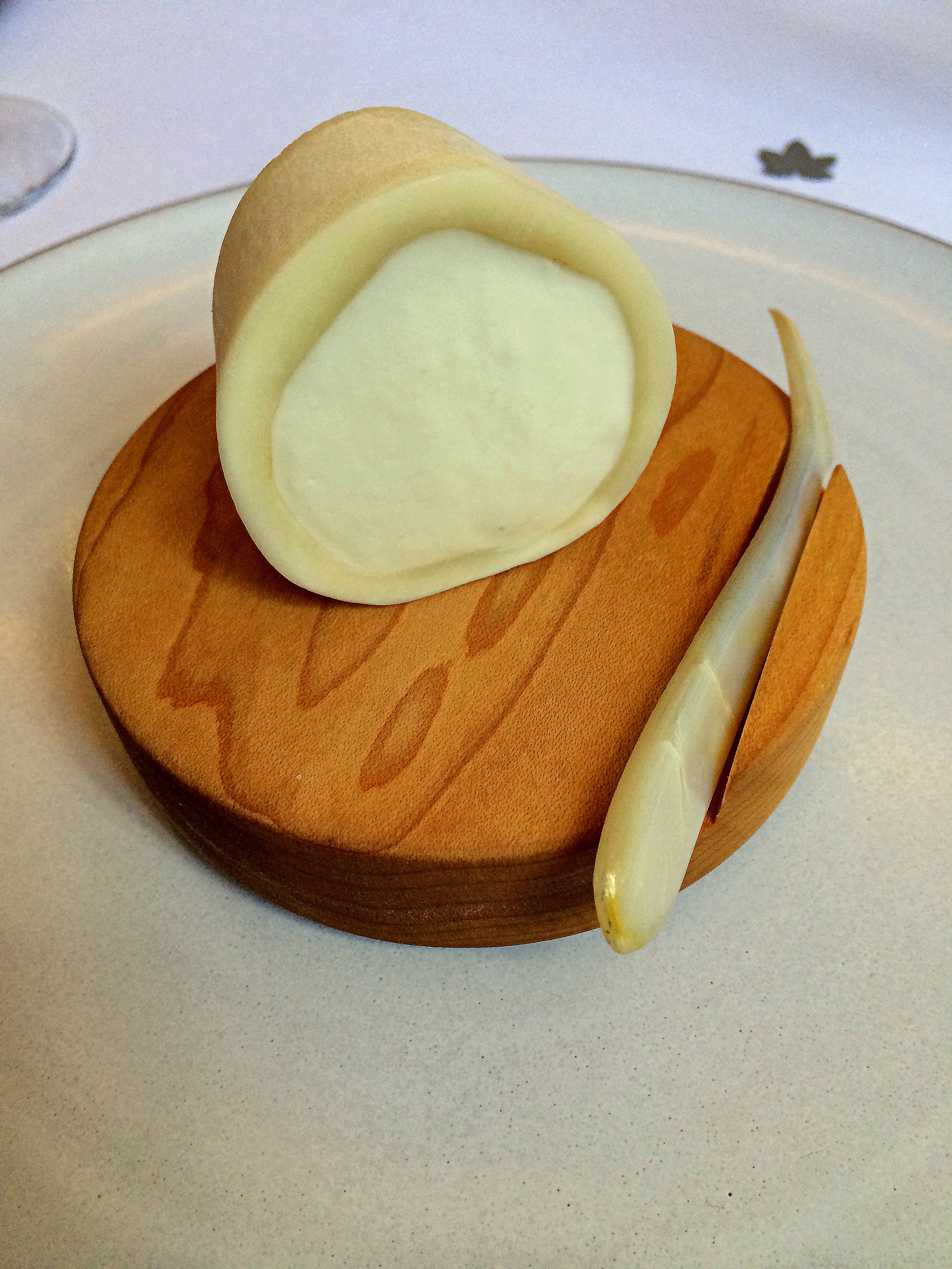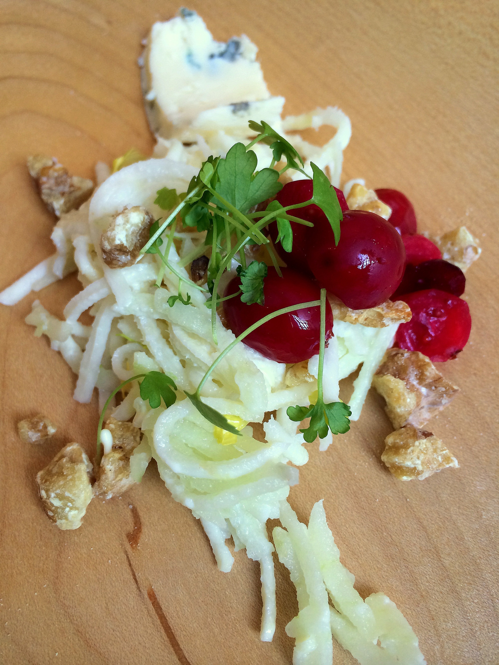 The following dish, again, had a gorgeous refreshing taste. It is called “Waldorf salad” because it was first created at Waldorf Hotel in New York in the late 1800s. The main ingredients of the salad were apple, celery and walnuts. Next to the sugar coated walnuts was a spoonful of mayonnaise flavored with lemon. The Eleven Madison Park version had also cranberries which pretty much boosted the salad.