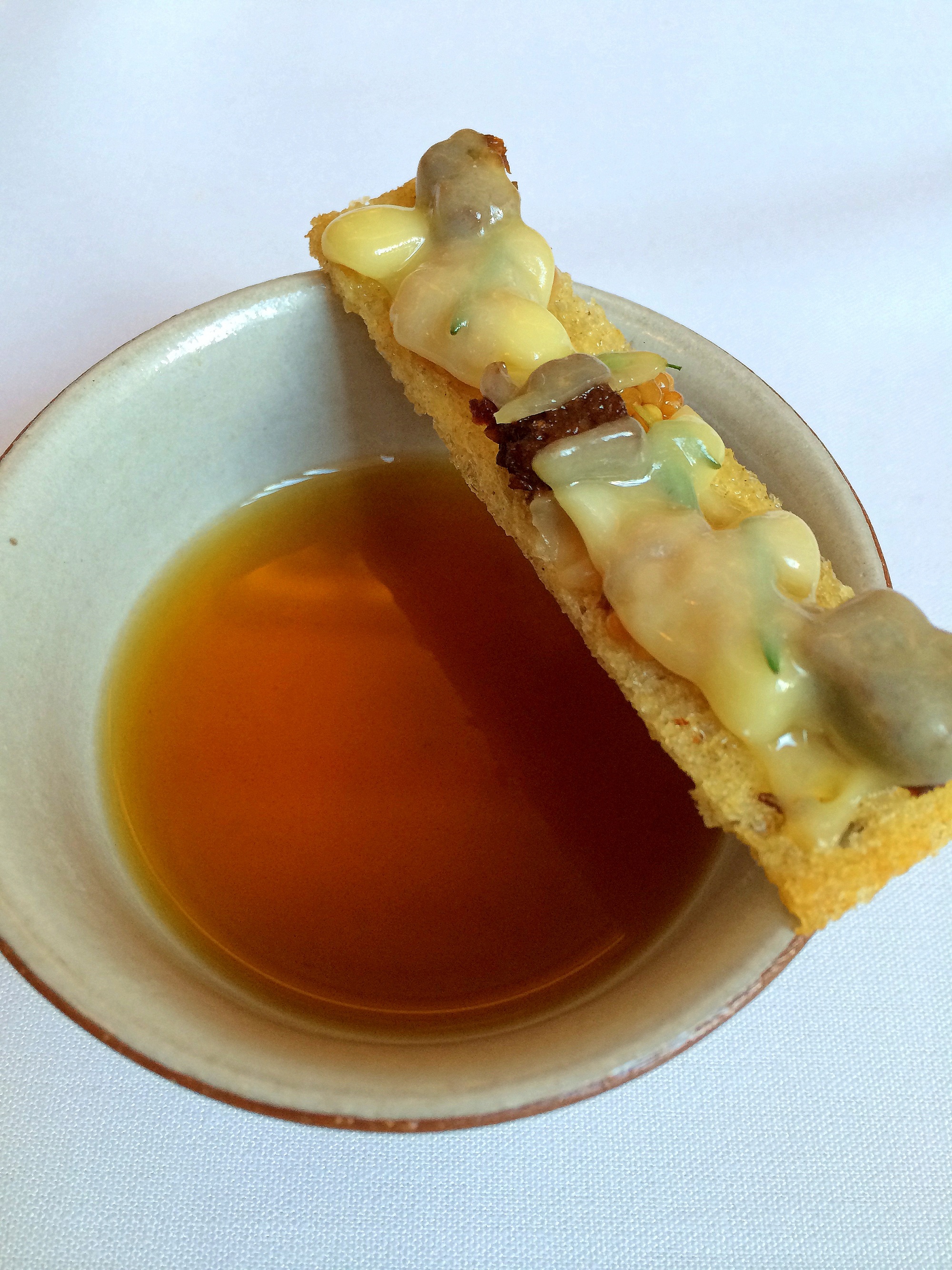 While the last main dish, the signature dish of Eleven Madison Park was being prepared, we were treated with a bowl of broth, accompanied by gruyere cheese, duck sausage and mustard seeds as well as crunchy croutons.