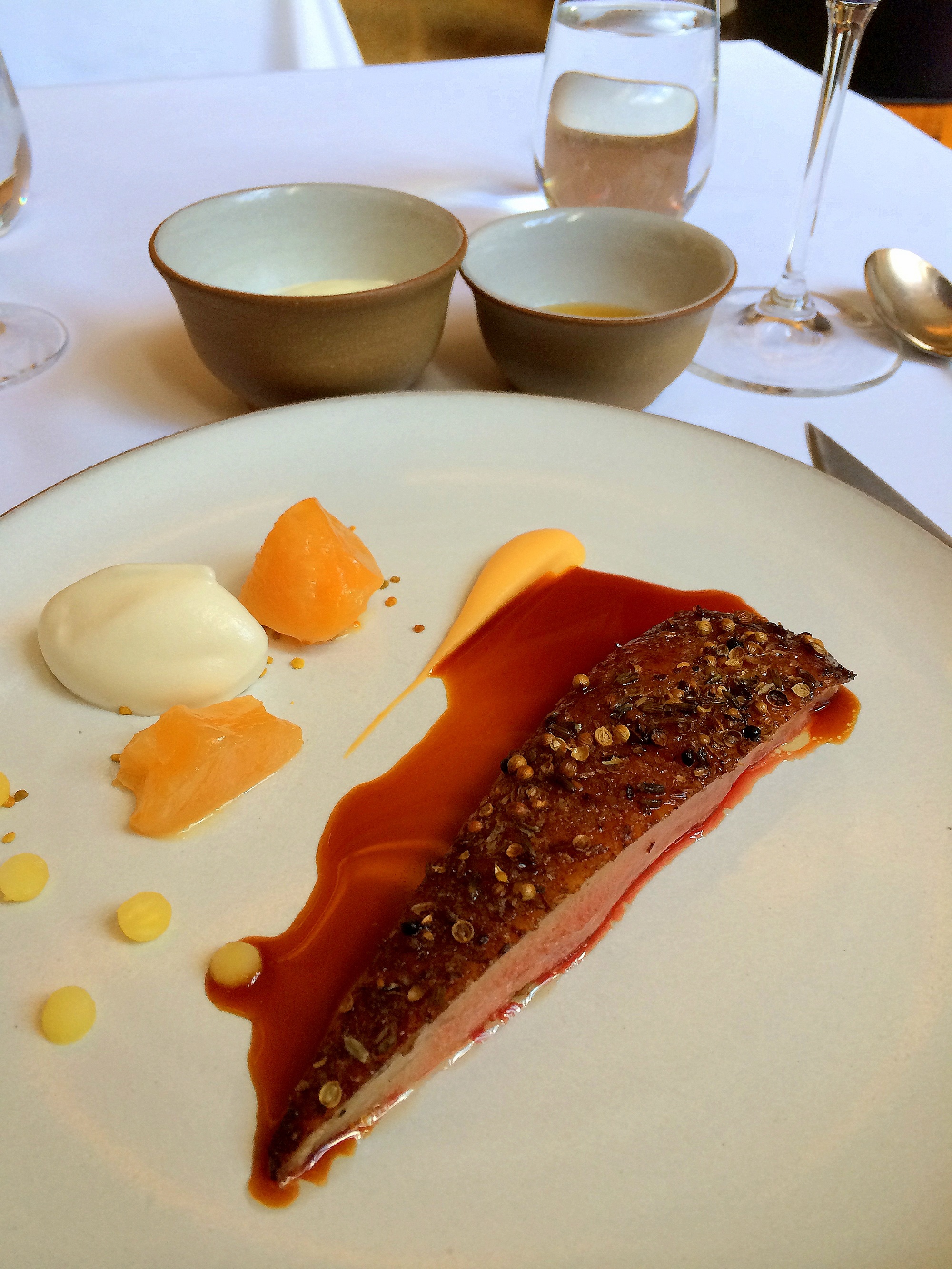 The following dish, duck looked like a painting. Underneath the crispy skin treated with honey, lavender and a kind of yellow turnip juice made from the Swedish turnip “rutabaga”, there was a delicate duck meat. Although I’m a fan of the duck dishes I ate in the Far East where the crispy skin is complemented with an accompaniment of crepe, this artistic and colorful presentation was an unforgettable version too.