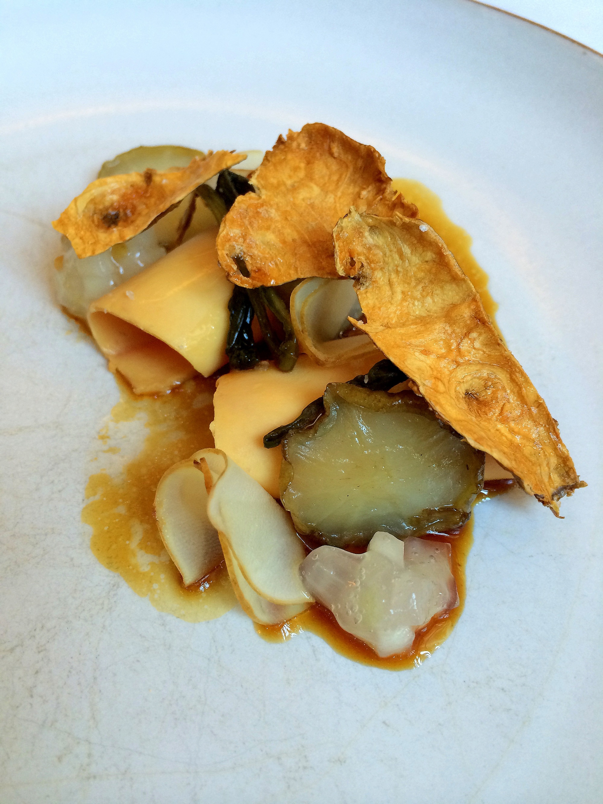 When we moved on to the foie gras dish, the version we chose was enriched with sunchokes and fermented mustard greens. Thanks to the both ingredients, the foie gras gained a gustatory depth. People also can choose the other seared version of “foie gras”.