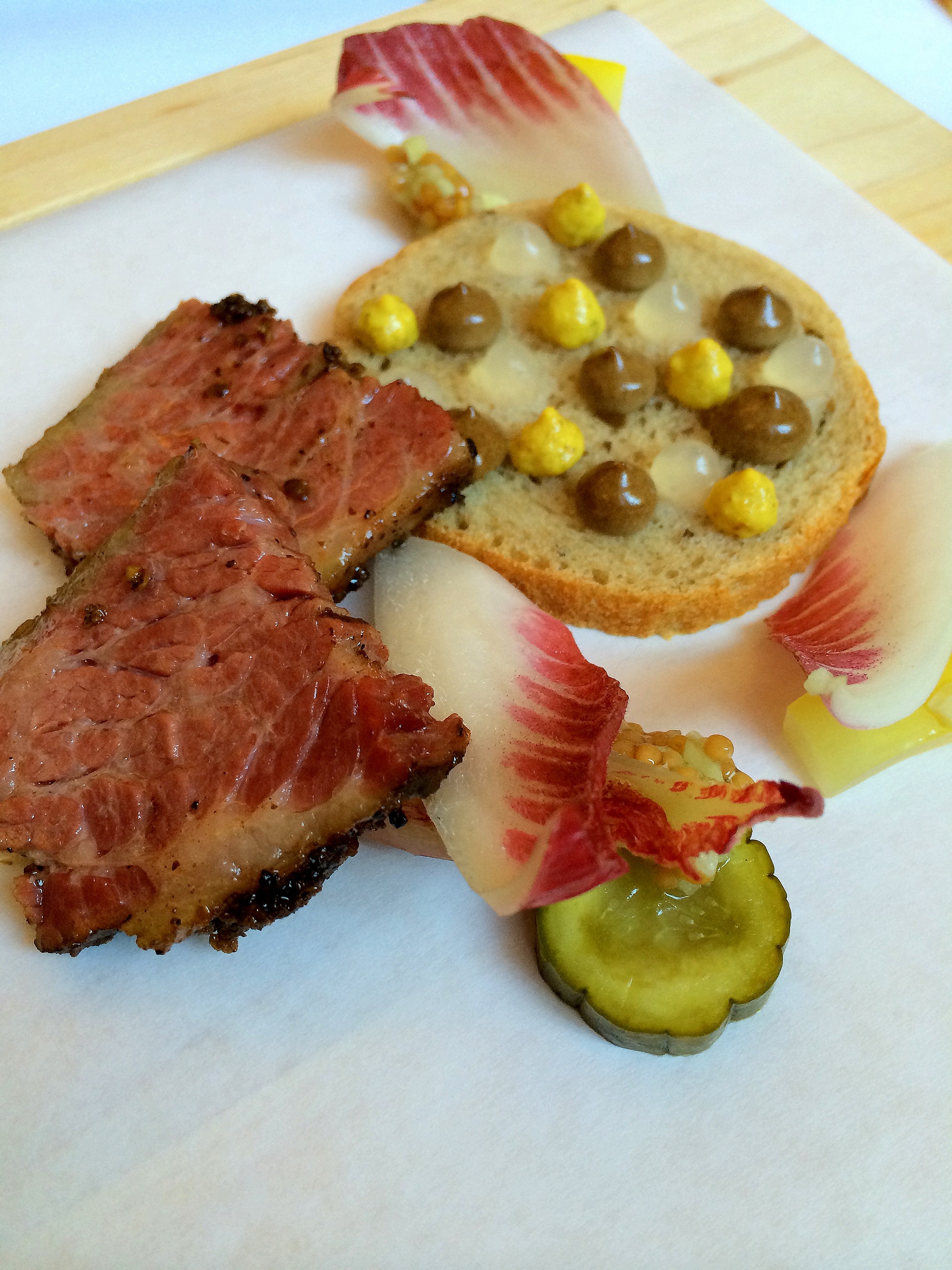 The rose beef pastrami dish reminded me of my school years in the U.S. Rye bread with mustard and garlic along with pickles and chicory were great accompaniments for the meat.