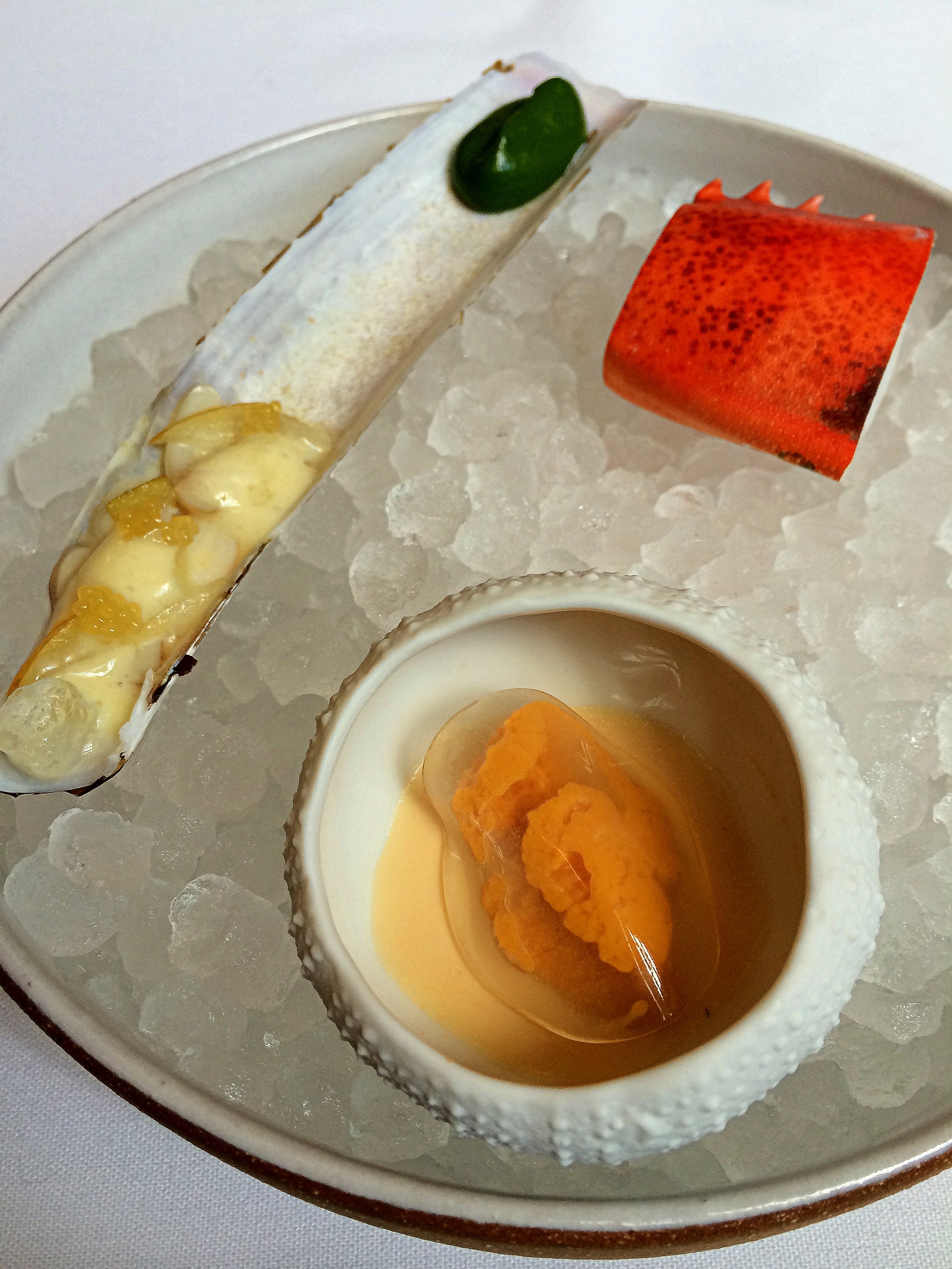 The next presentation consisted of two different dishes. The first one was the cold seafood dish which consisted of steamed lobster, sour crab salad, panna cota sea urchin, razor clams and slices of pear crowned with some collard puree. As the next step, the hot seafood dish was composed of lobster tail, again meaty razor clams, thin slices of pear and collards poached in lobster juice.