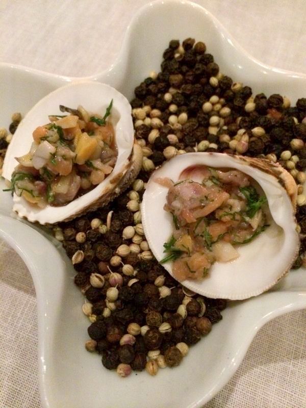 Masanın ilk konuğu somon füme tartar, bonfile ve midye parçacıklarından oluşan amuse bouche (damak hoşluğu) tabağı. Güzel kokunun faili ise tüm bu malzemelere yataklık eden siyah ve beyaz karabiber. Beyaz karabiber ile ilgili görüşümü daha önceki yazımda belirtmiş, yalnız görünüm için tercih edilen balon bir alternatif olduğunu söylemiştim. Ancak burada amaç göze ve burna hitap etmek olduğundan hiç de şikayetçi değilim. Nitekim ılık olarak getirilen karabiberler daha güçlü ve daha hoş bir kokuyla masamızı dolaşıyor.